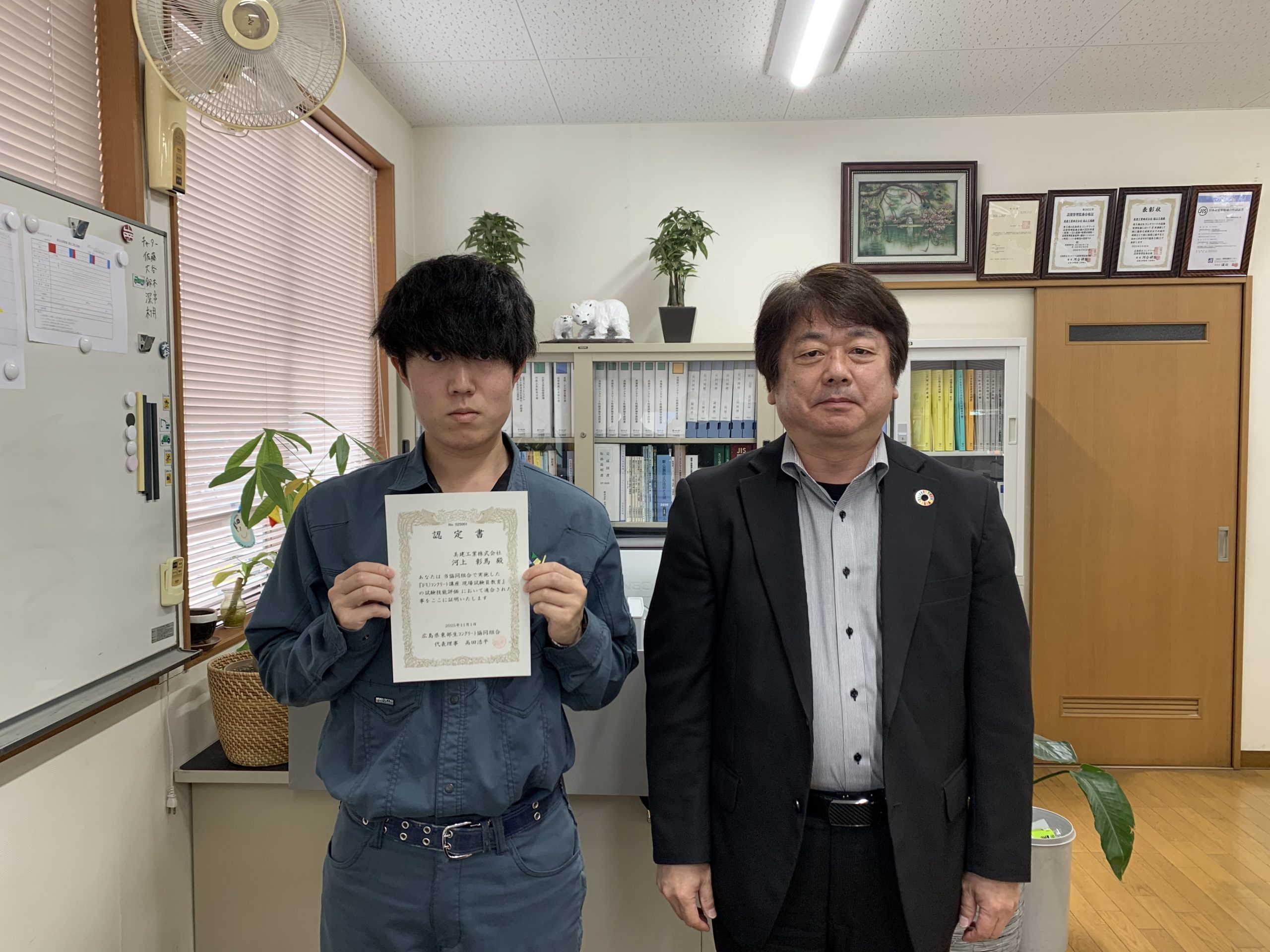 ホームFUコンクリート講座現場試験員教育『認定書』を授与しました 2025.11.17 現場試験員教育『認定書』を授与しました 福山北部生コン株式会社 重正 敬司 氏 美建工業株式会社福山工場 河上 彰馬 氏 <<一覧に戻る